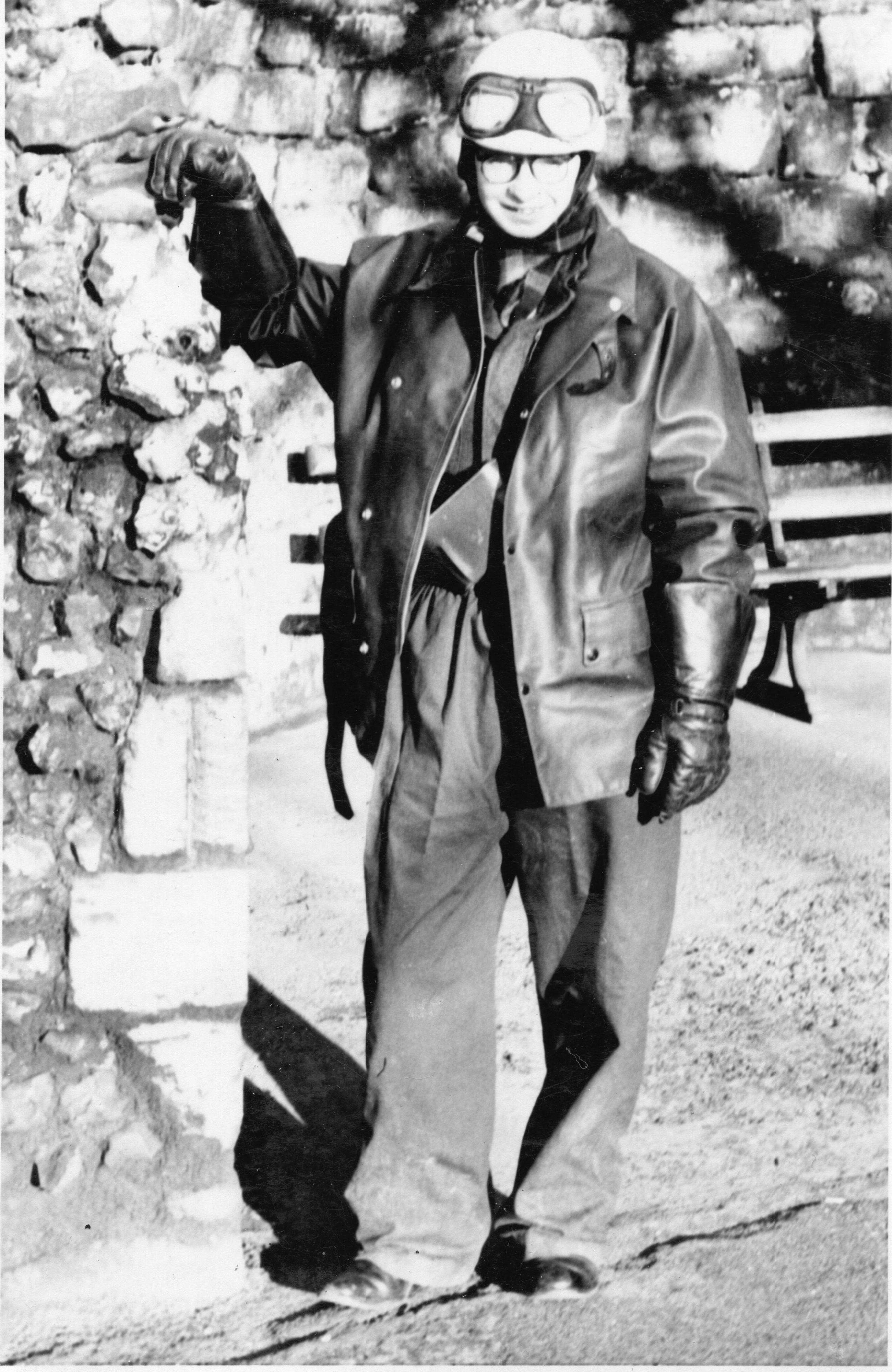 We are sorry that neither Michael nor I are able to add further details but I think that Jock may have dressed up for a special occasion even though I know that he never had a motorbike!!!!! You will notice that the gear he was wearing appeared to dwarf him, no doubt you will agree. I know that he wore glasses being very short sighted.